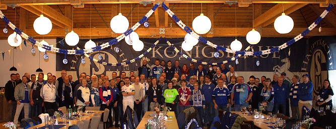Schon einen Tag vorher hat sich das Organisations-Team vom gastgebenden Fanclub „Königsblaue Niedersachsen e.V.“ zum Schmücken getroffen, um den Saal von Tony’s Restaurant in einen blau-weißen Tempel zu verwandeln. Was auch eindrucksvoll gelungen ist!